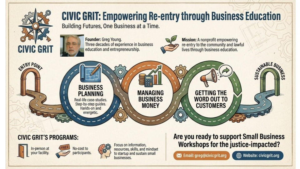 Civic Grit is a nonprofit organization dedicated to equipping incarcerated individuals with the knowledge, tools, and support to build lawful, self-directed lives through entrepreneurship and small business ownership.